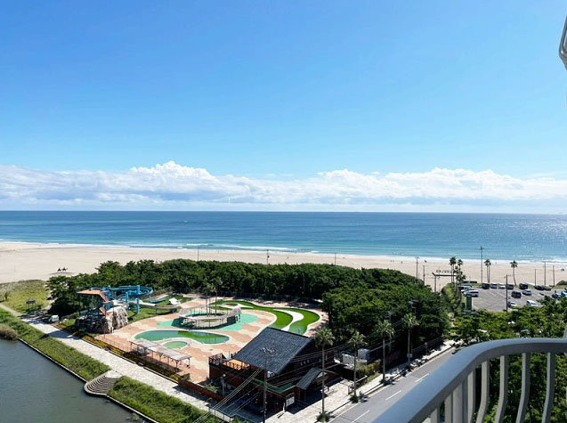 御宿中央海水浴場が目の前に広がるリゾートマンション。年間を通じ温暖な気候で海と山に囲まれた自然豊かな街。釣りやサーフィン、ゴルフの拠点に最適です。